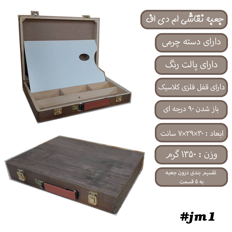 جعبه نقاشی ام دی اف در دو مدل تیره و روشن دارای دسته چرمی دارای پالت تقسیم بندی درون جعبه به ۵ قسمت ارسال توسط باربری (وانت یا ماشین برای حومه تهران) پرداخت هزینه ارسال موقع تحویل ارسال به سراسر ایران به جز شهر تهران